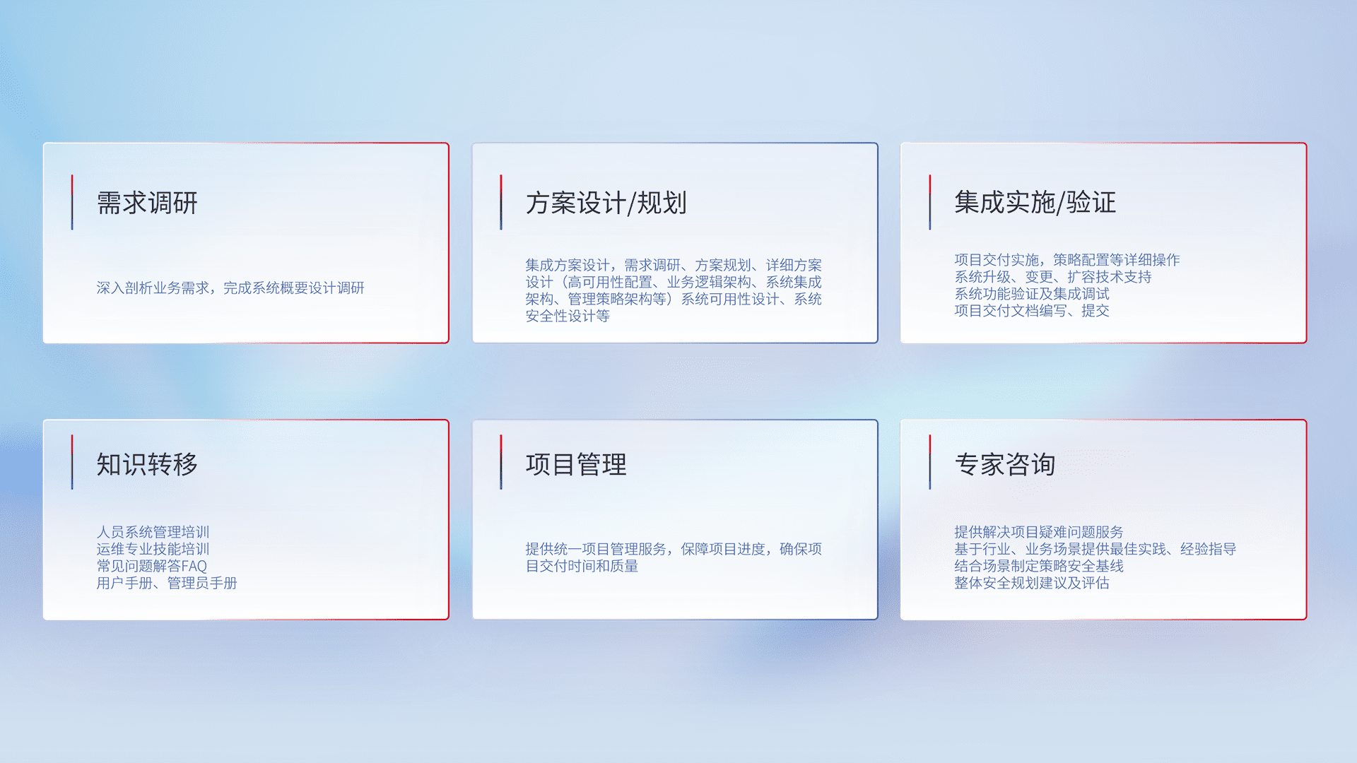 针对客户行业特性,,,将宏观的安全战略和需求,,,,通过专业的交付服务,,,实现项目落地,,,为客户提供标准规范的集成交付服务。。。